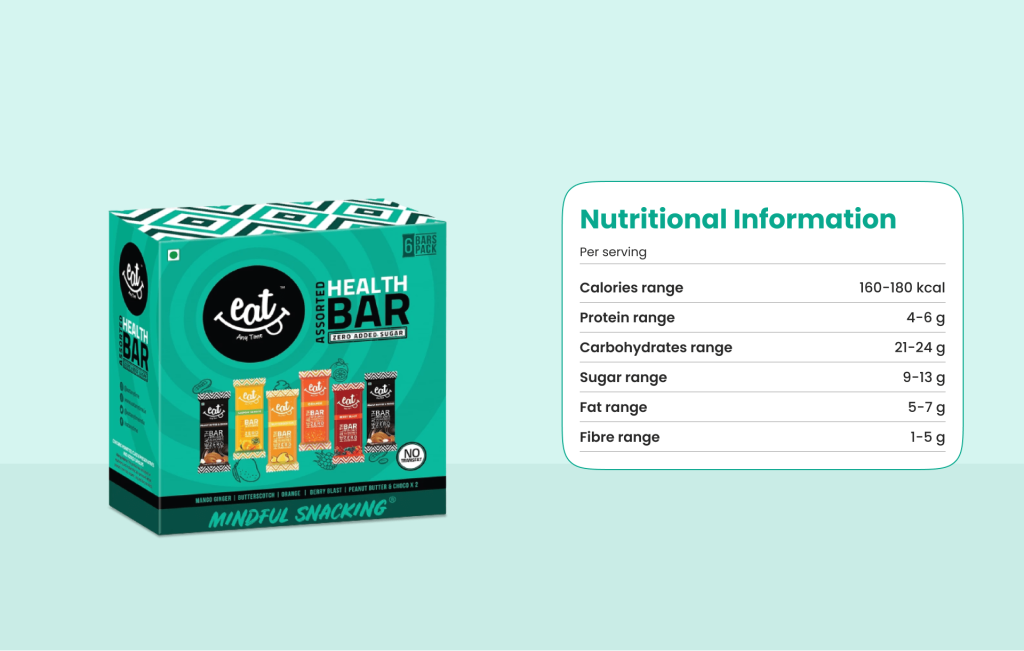 Made with a blend of natural ingredients like dates, nuts, oats, dried fruits, FOS (plant-based fibre), and honey. It contains only 1-5 grams of sugar, 3-6 grams of fat, 1-5 grams of fibre, and a protein range of 2-4 grams.